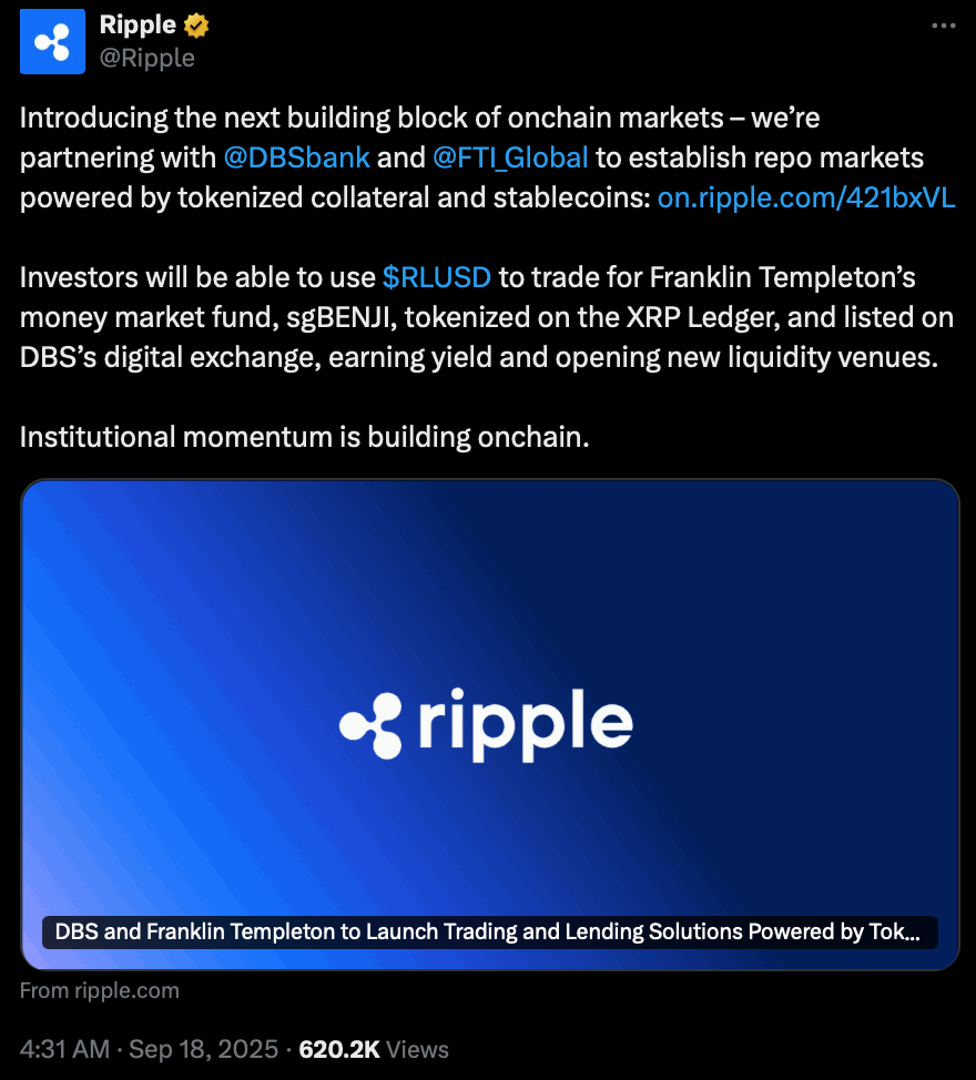 در کنار این خبر مهم، همکاری اخیر شرکت ریپل با بانک دیبیاس (DBS Bank) و شرکت مدیریت سرمایه فرانکلین تمپلتون (Franklin Templeton) برای راهاندازی صندوق بازار پول توکنیزهشده روی بلاکچین ریپل (XRP Ledger)، نیز میتواند کاربردهای واقعی این شبکه و تقاضا برای آن را افزایش دهد.
