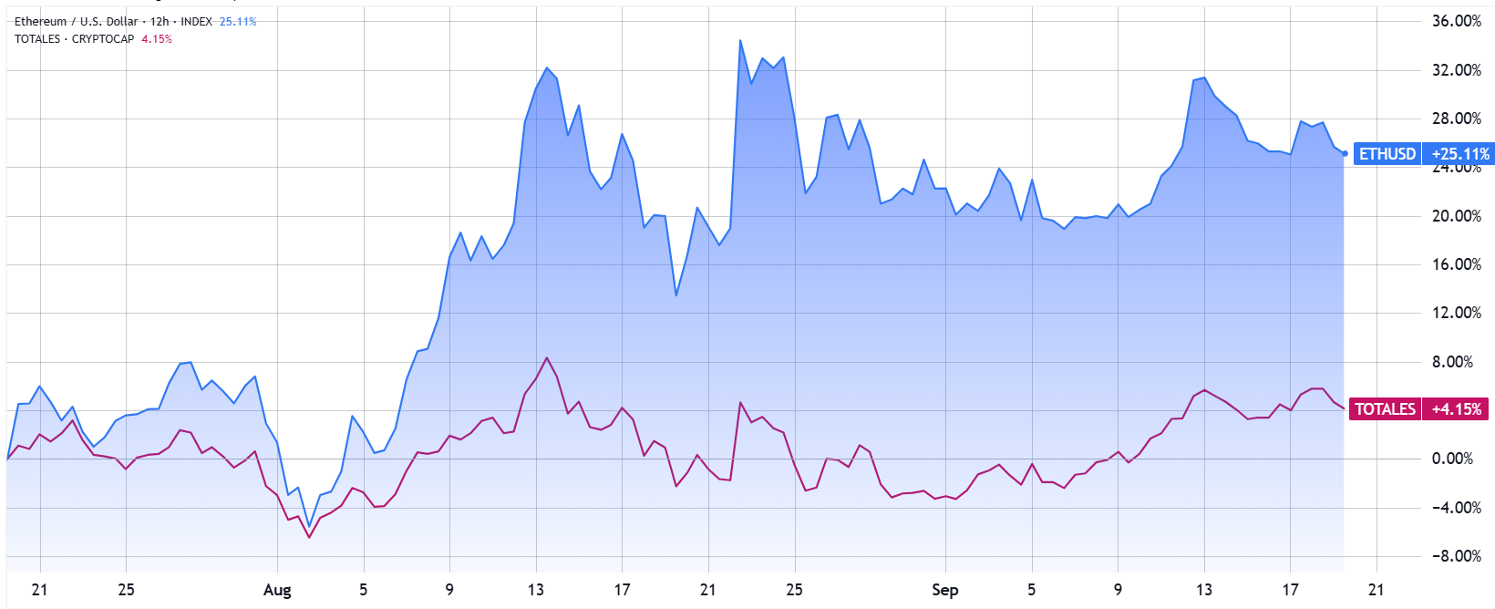 با وجود فشارهای کوتاهمدت، روند قیمت اتریوم در دو ماه اخیر ۲۱٪ بهتر از کل بازار کریپتو عمل کرده است.