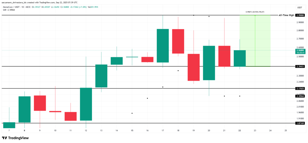 دفاع سرمایهگذاران از این سطح میتواند نقش تعیینکنندهای در حرکت بعدی میم کور داشته باشد. اگر این حمایت حفظ شود، احتمال رشد دوباره تا سقف تاریخی ۲.۹۹ دلار وجود دارد؛ این سیگنال، با توجه به موقعیت اندیکاتور پارابولیک سار (Parabolic SAR) در زیر کندلها، از مومنتوم صعودی حمایت میکند.