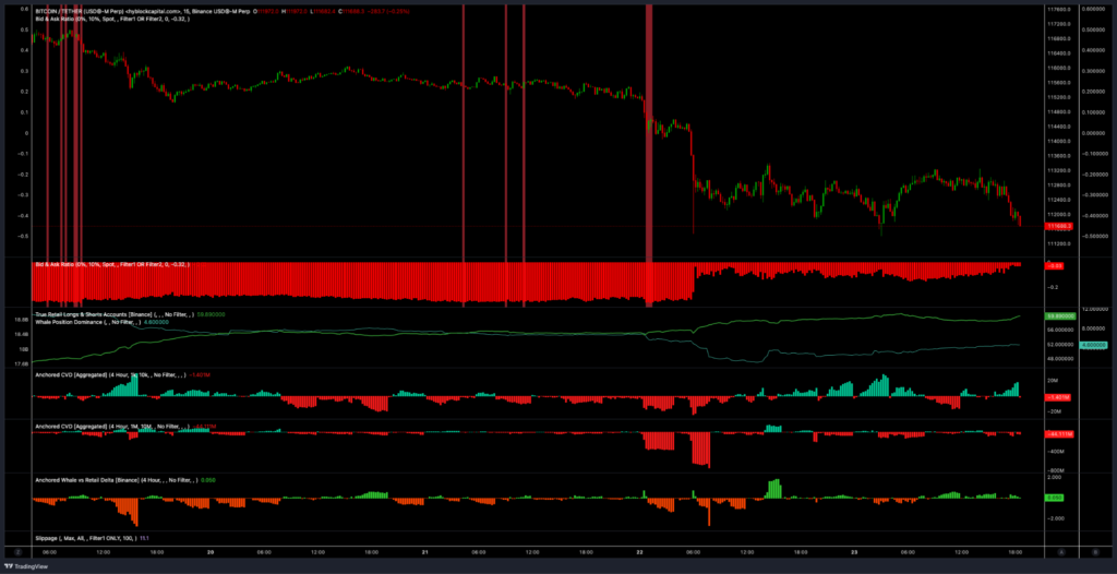 با وجود آنکه بیت کوین برای مدتی کوتاه بالای ۱۱۲٬۰۰۰ دلار قرار گرفت، دادههای تجمعی حجم دلتا (CVD) از پلتفرم Hyblock نشان میدهد که فروشندگان همچنان بر حرکت قیمت تسلط دارند و این موضوع احتمال یک اصلاح عمیقتر به سمت کف محدوده را افزایش میدهد.