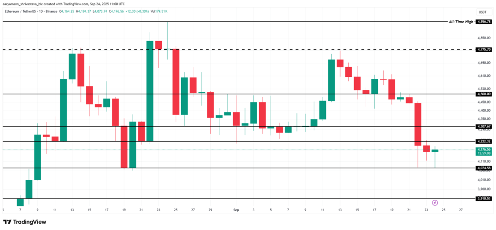 در حال حاضر، قیمت اتریوم روی سطح ۴,۱۷۶ دلار – درست بالای حمایت حیاتی ۴,۰۷۴ دلاری – معامله میشود. نزدیکترین مقاومت پیشروی این رمزارز نیز سطح ۴,۲۲۲ دلار است که عبور از آن میتواند راه را برای بازیابی بیشتر باز کند.