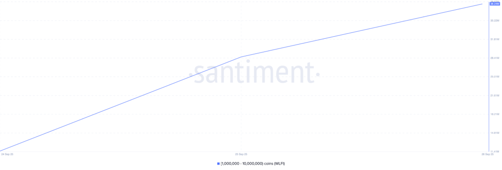 با وجود افت ۵ درصدی قیمت ورلد لیبرتی فایننشال در هفته گذشته، دادههای آنچین نشان میدهند آدرسهایی که بین ۱ تا ۱۰ میلیون WLFI در اختیار دارند، روند خرید خود را افزایش دادهاند و بیش از ۲۶ میلیون WLFI به سبدشان اضافه کردهاند.