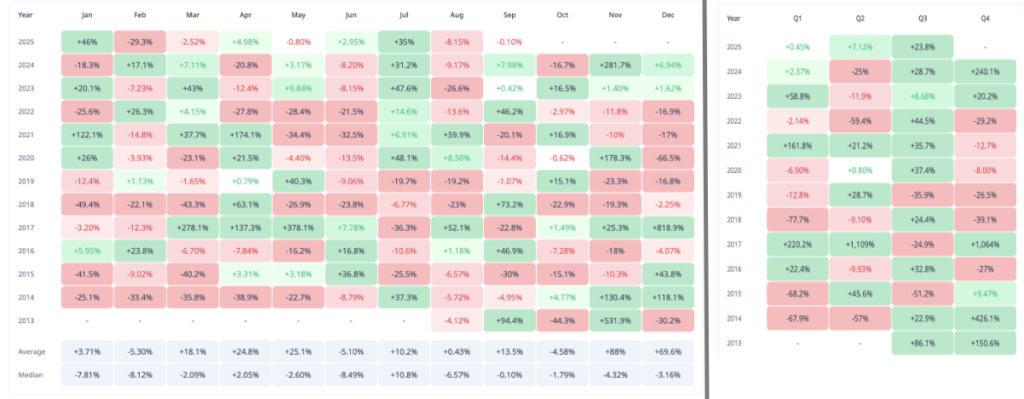 اما درست پس از اکتبر، ورق برمیگردد. دادههای کریپتورَنک (Cryptorank) نشان میدهد که سهماهه پایانی سال بهترین دوره برای ریپل بوده و میانگین رشد قیمت در این بازه به ۵۱٪ میرسد.