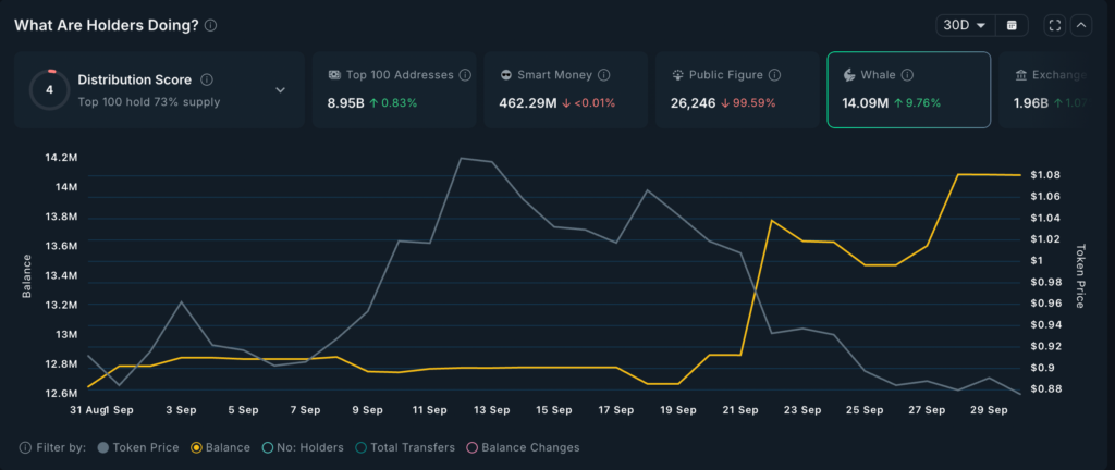 در همین بازه، صد نهنگ بزرگ بازار نیز موجودی ONDO خود را ۱٪ بیشتر کردهاند؛ این موضوع بهوضوح نشاندهنده رشد اعتماد نهادی و آمادهسازی برای جهش احتمالی در اکتبر است.