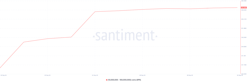 طبق دادههای سنتیمنت، تنها در ۱۰ روز گذشته، آدرسهایی که بین ۱۰ تا ۱۰۰ میلیون توکن SPX نگهداری میکنند، بیش از ۲۳ میلیون توکن به موجودی خود افزودهاند. چنین روندی بیانگر افزایش اعتماد این گروه از سرمایهگذاران است.