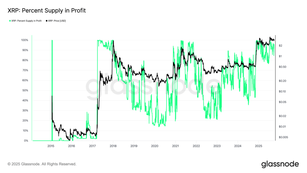 بررسی دادههای آنچین نشان میدهد که افزایش قیمت اخیر XRP، بر خلاف دورههای پیشین، با موج شدیدی از فروش یا برداشت سود همراه نبوده است. شاخص درصد عرضه در سود (Percent Supply in Profit) که سهم توکنهای سودآور از کل عرضه در گردش را نشان میدهد، از زمان جهش نوامبر ۲۰۲۴ تاکنون در سطوح بالا و پایدار باقی مانده است.
