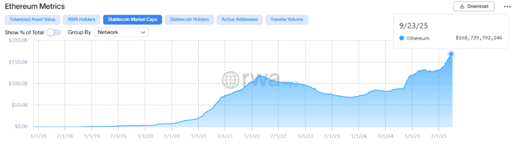 آنچه این بار وضعیت اتریوم را متمایز میکند، قدرت دادههای آنچین آن است. عرضه استیبل کوینها در شبکه اتریوم – با افزایش ۴۴٪ از ابتدای سال تاکنون – به رکورد تاریخی ۱۷۲ میلیارد دلار رسیده و تنها در ماه اکتبر حدود ۱ میلیارد دلار سرمایه جدید از طریق استیبل کوینها به این شبکه وارد شده است. این رشد باعث شد ارزش کل قفلشده (TVL) دوباره به سطح ۱۶۷ میلیارد دلار برسد، این سطح از سال ۲۰۲۱ تاکنون دیده نشده بود.