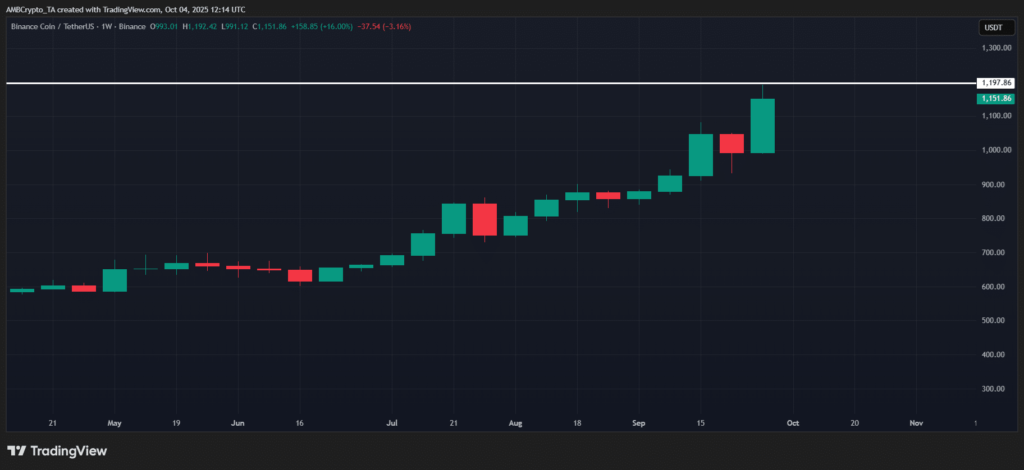 حدود ۲۶ میلیارد دلار سرمایه جدید به BNB تزریق شده و ارزش بازار آن را به ۱۶۶ میلیارد دلار رسانده است؛ این رقم اکنون معادل حدود ۴٪ از کل بازار ۴.۲ تریلیون دلاری کریپتو محسوب میشود. بر همین اساس، میانگین هزینه خرید تخمینی هر BNB به حدود ۱,۱۹۴ دلار رسیده است که رکوردی تاریخی بهشمار میآید.