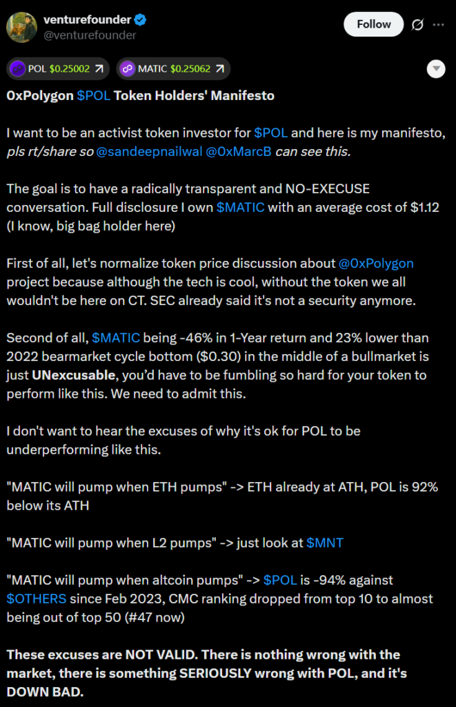 پیش از ارائه رسمی این پروپوزال، ونچرفاندر مانیفستی در شبکه اجتماعی X منتشر کرد که بیش از ۲۵,۰۰۰ بازدید داشت. او در آن پست، افت ۴۶ درصدی قیمت POL طی یک سال گذشته را «غیرقابلقبول» توصیف کرد و گفت: