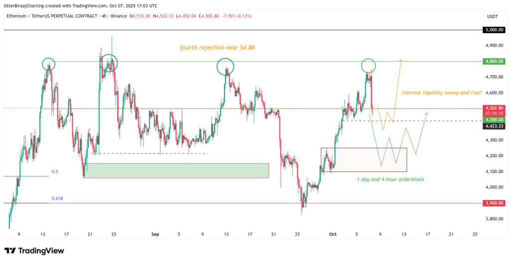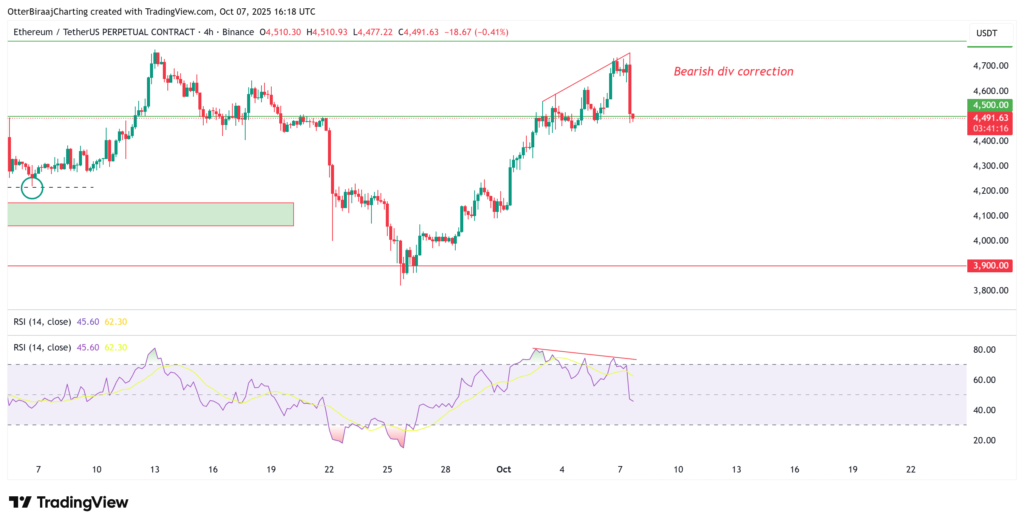 در روز دوشنبه، همزمان با صعود بیت کوین به اوج تاریخی جدید، قیمت اتریوم نتوانست مقاومت ۴,۸۰۰ دلاری را بشکند و روز سهشنبه با افتی حدود ۳٪ تا محدوده ۴,۵۰۰ دلار عقبنشینی کرد. این کاهش پس از شکلگیری واگرایی منفی در نمودار چهارساعته اتفاق افتاد که معمولاً نشاندهنده کاهش قدرت خریداران و احتمال اصلاح کوتاهمدت است.