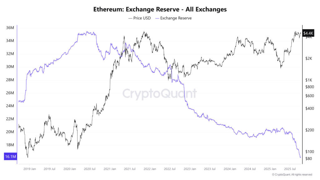 با این حال، دادههای آنچین نشان میدهد که این فاصله در حال کاهش است. ذخایر اتریوم در صرافیها به حدود ۱۶.۱ میلیون واحد رسیده که نسبت به سال ۲۰۲۲ بیش از ۲۵٪ کاهش یافته است که از افت فشار فروش حکایت دارد.