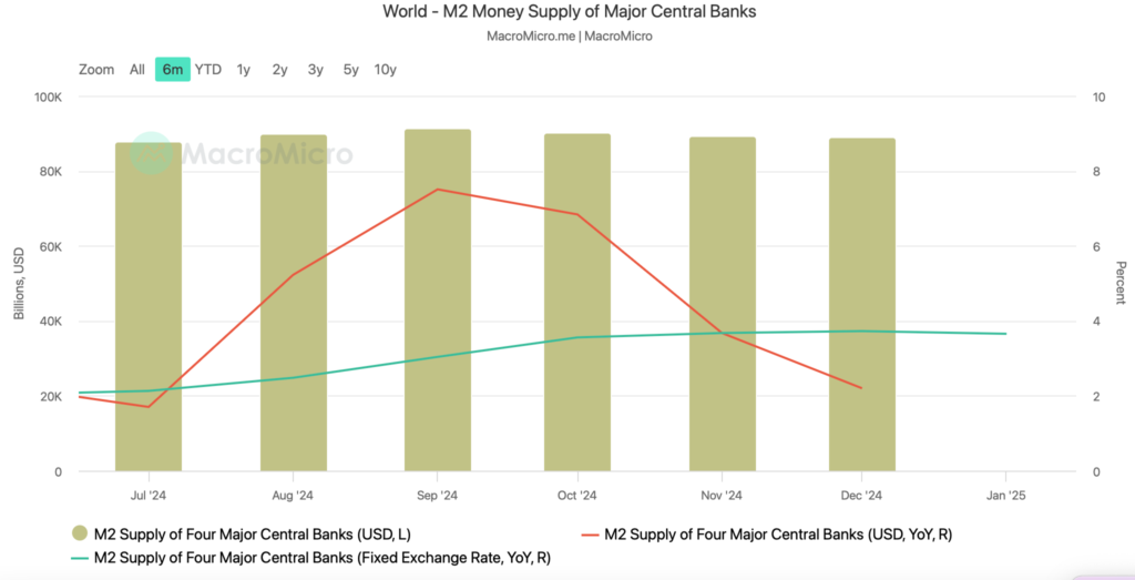 بسیاری از تحلیلگران کریپتو به روندهای تاریخی اشاره میکنند که در آن، افزایش عرضه جهانی M2 منجر به افزایش قیمت بیت کوین شده است، زیرا این افزایش معمولاً نقدینگی بیشتر و کاهش نرخ بهره را به دنبال دارد.