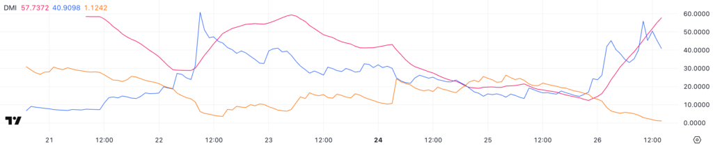 شاخص حرکت جهتدار (DMI) برای پای نتورک نشان میدهد این رمزارز در یک روند صعودی بسیار قوی قرار دارد. شاخص میانگین جهتدار (ADX) آن در ۲۴ ساعت گذشته از ۱۲.۳ به ۵۷.۷ افزایش یافته است که بیانگر شدت بالای روند است.