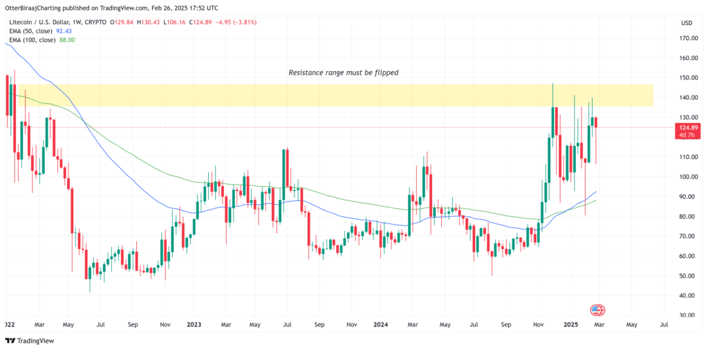 با توجه به نقدینگی موجود در سمت عرضه، لایت کوین برای خروج از محدوده مقاومتی خود، نیاز به بسته شدن کندل هفتگی در بالای سطح ۱۳۳ دلار دارد.