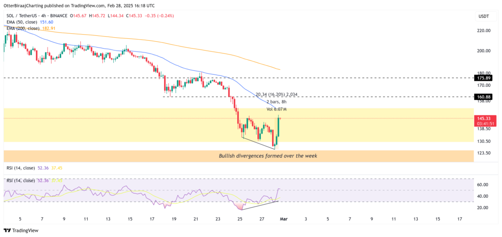 از تاریخ ۲۴ فوریه (۶ اسفند)، سولانا یک سری کف پایینتر (Lower Low) را تا رسیدن به کمترین قیمت سالانهاش در ۱۲۵ دلار در روز جمعه شکل داد. در طول این دوره، واگرایی مثبت واضحی بین قیمت و شاخص قدرت نسبی (RSI) مشاهده شد.