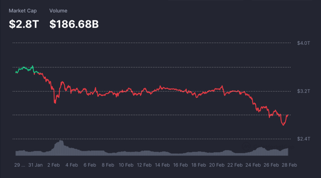 طبق دادههای کوین مارکت کپ، ارزش کل بازار کریپتو در حال حاضر ۲.۸ تریلیون دلار است که از اوج ۳.۶۲ تریلیون دلاری ثبتشده در ژانویه ۲۰۲۵ کاهش یافته است.
