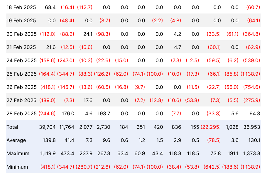 تاریخ ۲۵ فوریه بدترین روز برای ETFهای بیت کوین آمریکا بود، زیرا میزان خروج سرمایه به ۱.۱۳ میلیارد دلار رسید. این خروج گسترده، با کاهش ۱۷.۶٪ قیمت بیت کوین از تاریخ ۱۸ فوریه همزمان شد که باعث رسیدن قیمت بیت کوین به پایینترین سطح چهارماهه خود در ۷۸,۹۴۰ دلار شد.