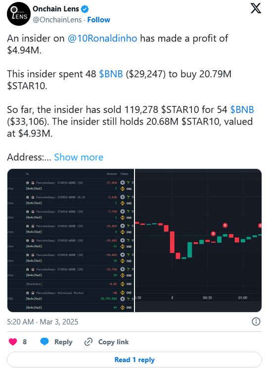 پلتفرم آنچین لنز (Onchain Lens) همچنین اعلام کرد کیف پولی که به فعالیتهای داخلی در ارتباط با توکن STAR10 رونالدینیو مرتبط است، سرمایهگذاری اولیه ۲۹,۲۴۷ دلار خود را به ۴.۹۴ میلیون دلار سود غیرتحققیافته تبدیل کرده است.