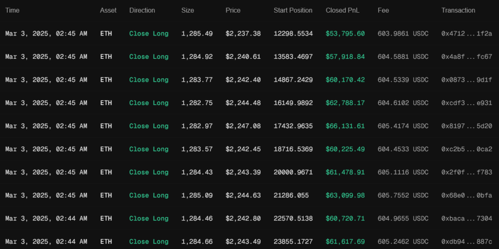 طبق دادههای پلتفرم تحلیلی هایپر دش (HyperDash)، این نهنگ در اول ماه مارچ ۵.۹ میلیون دلار USDC به صرافی غیرمتمرکز هایپرلیکویید (HyperLiquid) واریز کرد تا پوزیشنهای خرید خود را باز کند. او اولین پوزیشن خرید اتریوم خود را در تاریخ ۲ مارچ (۱۲ اسفند) در ساعت ۱۸:۱۱ به وقت تهران باز کرد.