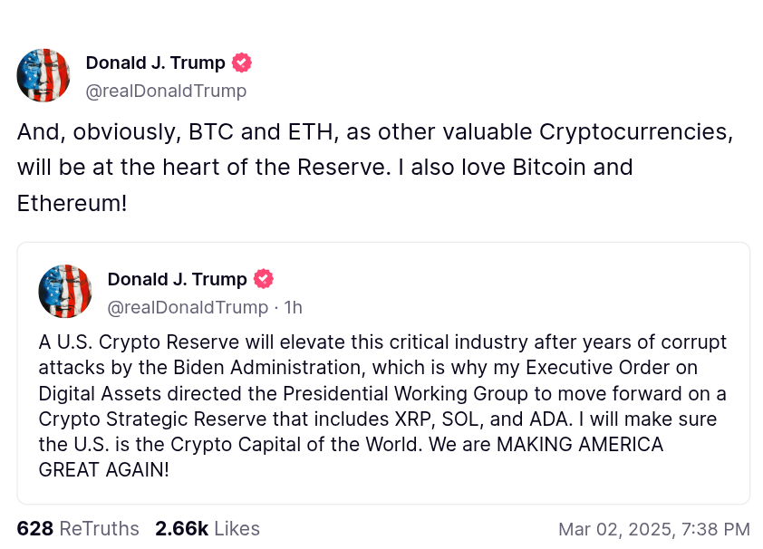 تردیدهای اولیه درباره اینکه آیا بیت کوین و اتریوم در این طرح نقش خواهند داشت به سرعت رفع شدند، زیرا ترامپ مستقیماً به این دو کوین اشاره کرد و گفت که هر دو را دوست دارد.