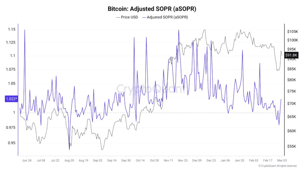 توتنشولر به نشانههای مشابهی در شاخص aSOPR (نسبت سود خروجی تعدیلشده) اشاره کرد، شاخصی که نشان میدهد آیا کوینهای منتقلشده آنچین با سود یا زیان جابهجا شدهاند.