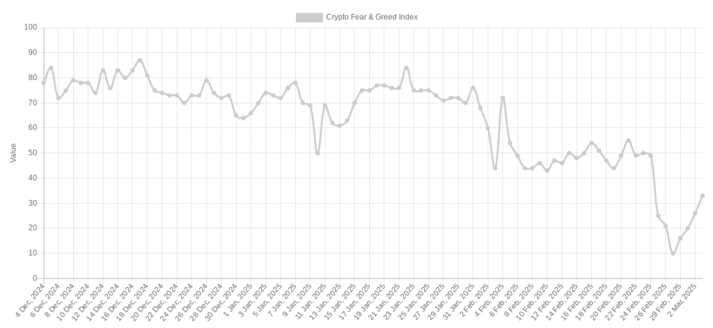 با وجود اخبار مثبت آخر هفته، احساسات لی بازار کریپتو همچنان به تاییدیههای بیشتری نیاز دارد. شاخص ترس و طمع کریپتو که با استفاده از مجموعهای از عوامل، احساس کلی بازار را ارزیابی میکند، همچنان در محدوده ترس قرار دارد. این شاخص در تاریخ ۳ مارچ (۱۳ اسفند) حدوداً ۳۳٪ بود، هرچند که نسبت به کف محلی ۱۰٪ در هفته گذشته، بهبود قابل توجهی داشته است.