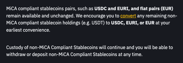 صرافی بایننس اعلام کرد که کاربران تا ساعت ۲۳:۵۹ به وقت جهانی در تاریخ ۳۱ مارچ (۱۲ فروردین ۱۴۰۴ و ساعت ۰۳:۲۹ به وقت تهران) همچنان قادرند تا از استیبل کوینهای غیرمطابق با MiCA در معاملات اسپات استفاده کنند.