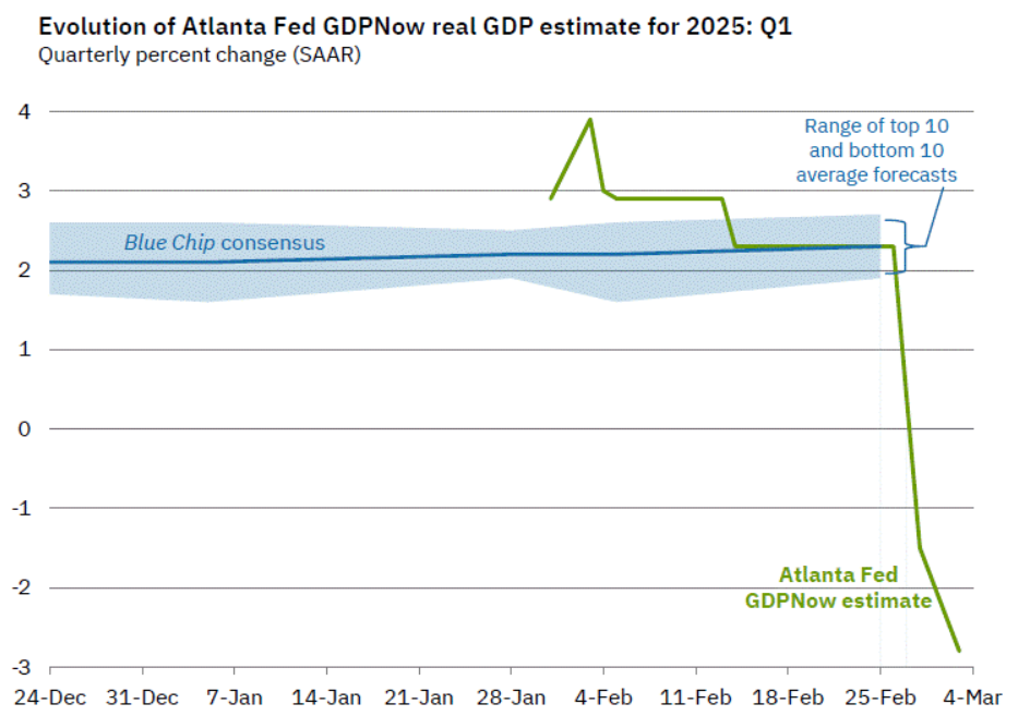 البته، همه مدلهای تولید ناخالص داخلی چشمانداز بدی مانند مدل GDPNow فدرال رزرو آتلانتا ندارند. مدل فدرال رزرو نیویورک در آخرین به روز رسانی ۲۸ فوریه خود برای سه ماهه اول ۲.۹٪ افزایش را پیشبینی کرد، در حالی که ردیاب GDP از فدرال رزرو دالاس افزایش ۲.۴٪ را در ۲۷ فوریه پیشبینی کرد.