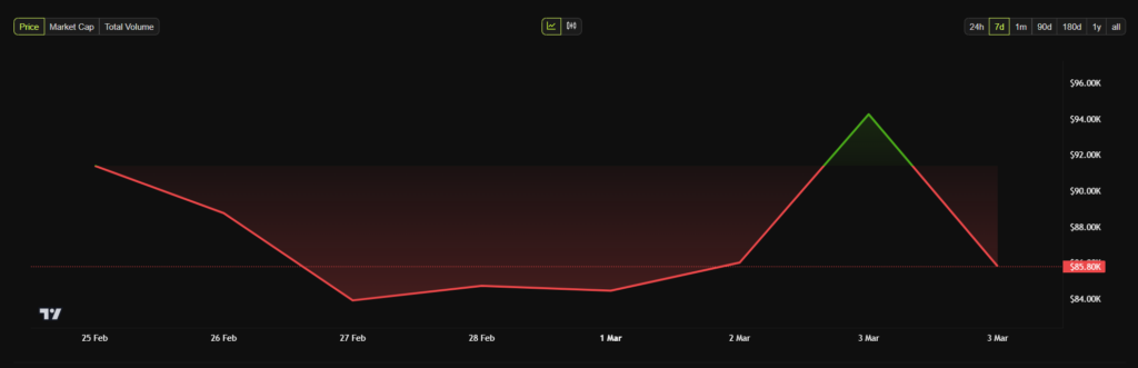 بیت کوین دوباره نزولی شد و تمام سودهای آخر هفته خود را از دست داد. در حالی که خبر ذخیره کریپتویی ترامپ برای مدت کوتاهی از این روند منفی جلوگیری کرد، اما مشکلات کلان اقتصادی همچنان پابرجاست.