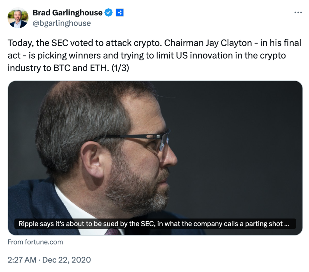 سپس در دسامبر ۲۰۲۰، شکایت ریپل بهعنوان یک هشدار جدی به صنعت کریپتو مطرح شد. اتهام این بود که فروش توکن XRP توسط ریپل «یک عرضه بدون ثبتنام و غیرقانونی برای چندین سال» بوده است که الگویی برای تمام اقدامات اجرایی بعدی SEC شد.