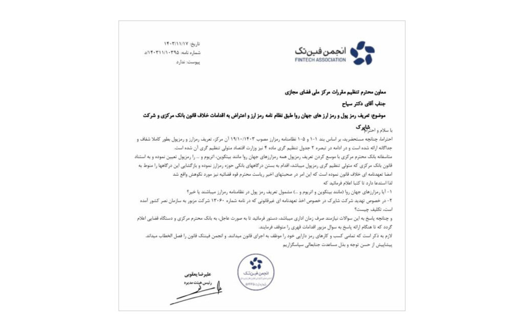 اما در آخرین تحولات، در تاریخ ۱۲ اسفند، امیر سیاح، سرپرست معاونت اقتصادی و تنظیم مقررات در پاسخ به نامه پیشین انجمن فینتک نامهای خطاب به علیرضا یعقوبی، رئیس هیئتمدیره این انجمن ارسال کرده و حرفهای جالبی زده که قابل تامل هستند.