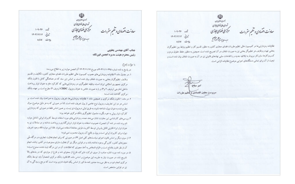 بر اساس این نامه، که تصویر و متن کامل آن بالا آورده شده است، طبق نظامنامه رمزداراییها، بانک مرکزی مسئول تنظیمگری رمزارزهایی است که بهعنوان ابزار پرداخت داخلی یا خارجی یا رمزپول ملی (CBDC) استفاده میشوند.