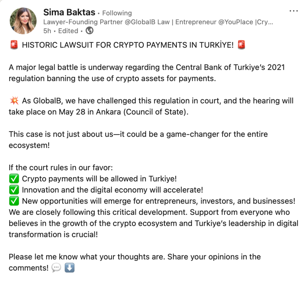 شرکت گلوبال بی در این جلسه دادرسی قصد دارد یک استراتژی را برای نشان دادن مزایای اقتصادی بلندمدت پرداختهای رمزارزی در ترکیه ارائه کند. بکتاش در گفتوگویی اظهار داشت:
