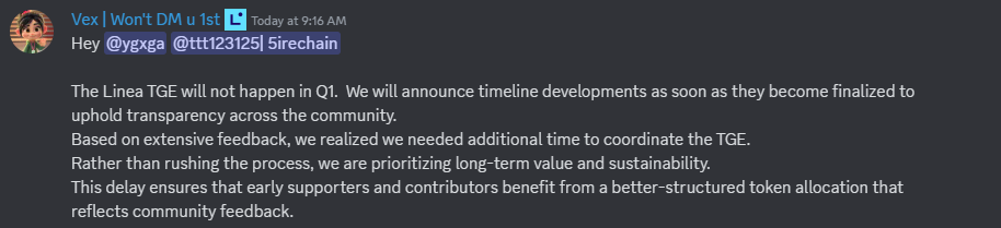 یکی از مدیران لینیا (Linea Discord) در بیانیهای در دیسکورد این پروژه گفت که پس از مشورت و دریافت نظرات متعدد از جامعه کاربران و حامیان خود، متوجه شد که برای انجام هماهنگیهای لازم و دستیابی به یک توکنومیک بهینه، نیاز به زمان بیشتری دارد.