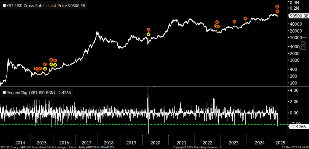 اگر از پنجره تاریخ به روند اخیر شاخص دلار آمریکا نگاه کنیم، سخت است که دیدگاهمان به بیت کوین صعودی نباشد. من یک بررسی آماری انجام دادم و متوجه شدم که ریزشهای سهروزه بیش از ۲٪ و ۲.۵٪ در شاخص دلار، همیشه در کفهای بازار نزولی بیت کوین (نقاط عطف) یا در میانه روندهای صعودی آن رخ دادهاند.