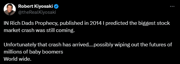 رابرت کیوساکی، نویسنده کتاب معروف «پدر پولدار، پدر بیپول»، در پستی در پلتفرم X اعلام کرد که پیشبینی او در کتاب «پیشگویی پدر پولدار» که در سال ۲۰۱۴ منتشر شده بود، اکنون به واقعیت پیوسته است.