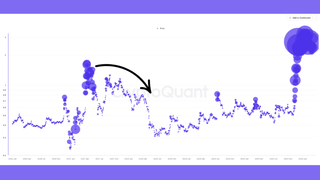 در سال ۲۰۲۱، افزایش مشابه در حجم معاملات ریپل، پیش از یک روند نزولی طولانیمدت رخ داد، زیرا فشار فروش در نهایت بر تقاضا غلبه کرد. اگر تاریخ تکرار شود، XRP میتواند اصلاح بزرگ دیگری را تجربه کند که با شکست الگوی مثلث متقارن همراستا خواهد بود.