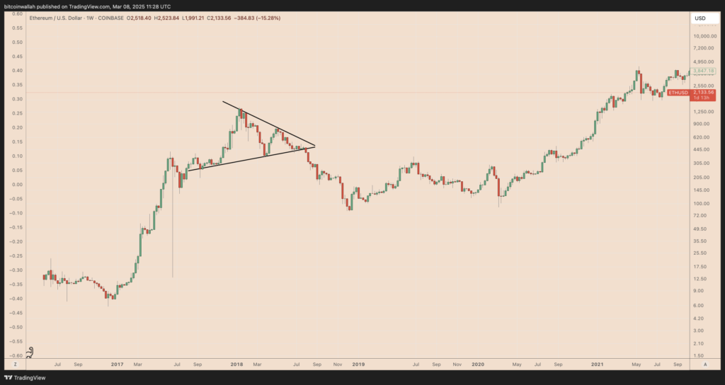 در گذشته، چنین الگوهایی بیشتر منجر به کاهش قیمت شدهاند تا اینکه باعث ادامه روند صعودی شوند. برای مثال، شکست الگوی مثلث در نمودار قیمت اتریوم در سال ۲۰۱۸، باعث سقوط ۸۰٪ آن شد.