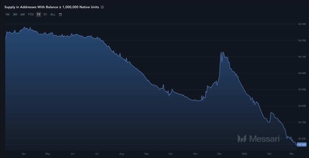 کاهش دارایی نهنگهای ریپل نیز نشانهای از فاز توزیع است. در طول سال گذشته، موجودی نهنگها از ۹۴.۲۱ میلیارد XRP به ۹۰.۲۱ میلیارد کاهش یافته و افزایش حاصل از پامپ ترامپ، پس از انتخابات آمریکا را از بین برده است.