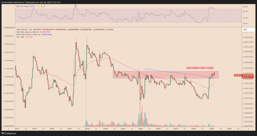 در همین حال، قیمت ریپل در برابر بیت کوین در محدوده تاریخی توزیع قرار دارد، اما همچنان بالاتر از میانگین متحرک نمایی ۲۰۰ دورهای برای تایم فریم ۲ هفتهای در محدوده ۲,۲۴۵۹ ساتوشی معامله میشود.