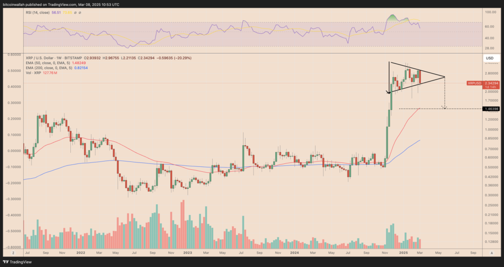 زمانی که شکست الگو رخ میدهد، قیمت معمولاً به سمت سطحی حرکت میکند که فاصله آن با نقطه شکست برابر با ارتفاع حداکثری مثلث است. با اعمال این قاعده بر ریپل، تارگت نزولی آن حدوداً ۱.۴۶ دلار خواهد بود که با میانگین متحرک نمایی ۵۰ هفتهای همراستاست.