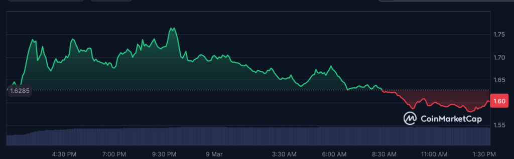 قیمت خرید کایتو در طول ۲۴ ساعت گذشته ۱.۴۱٪ کاهش یافته و در زمان نگارش مطلب، به ۱.۶ دلار رسیده است.