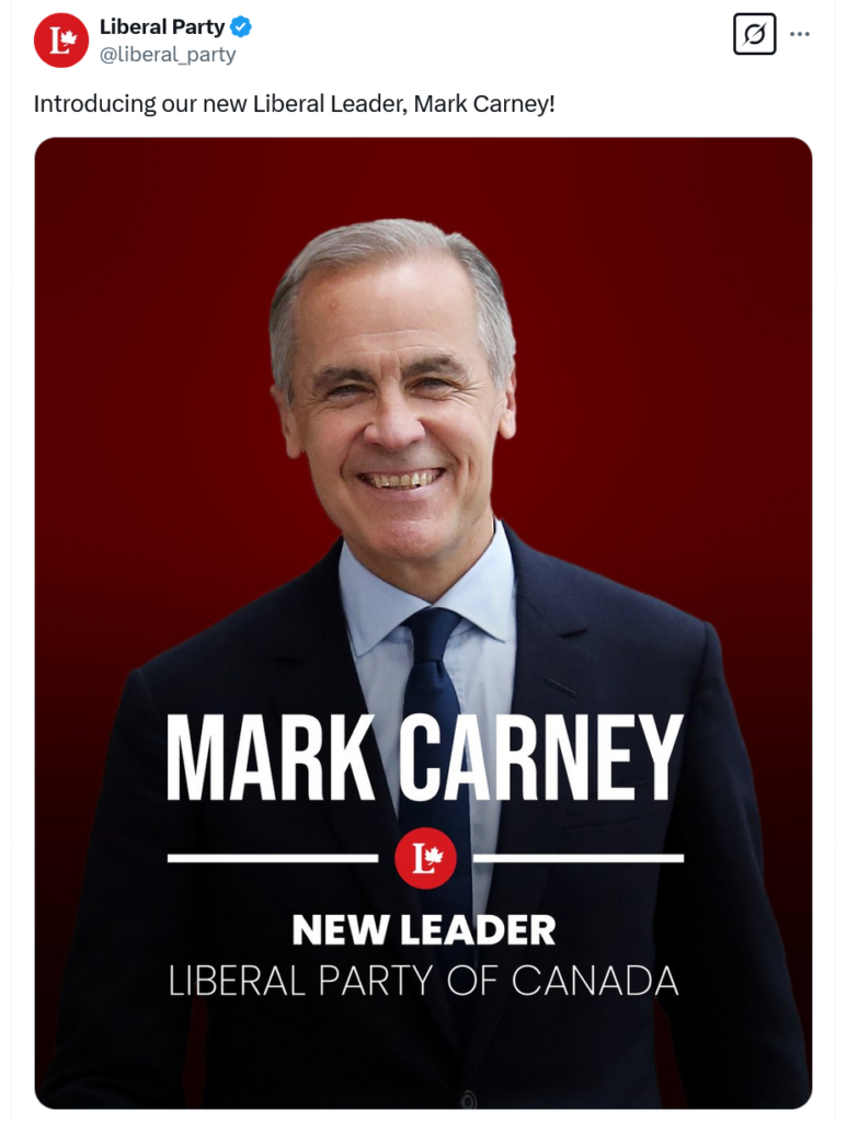 مارک کارنی در تاریخ ۹ مارچ (۱۹ اسفند) با اختلاف بالای آرا بهعنوان جانشین جاستین ترودو انتخاب شد. ترودو بیش از ۷ سال این سمت را در اختیار داشت.