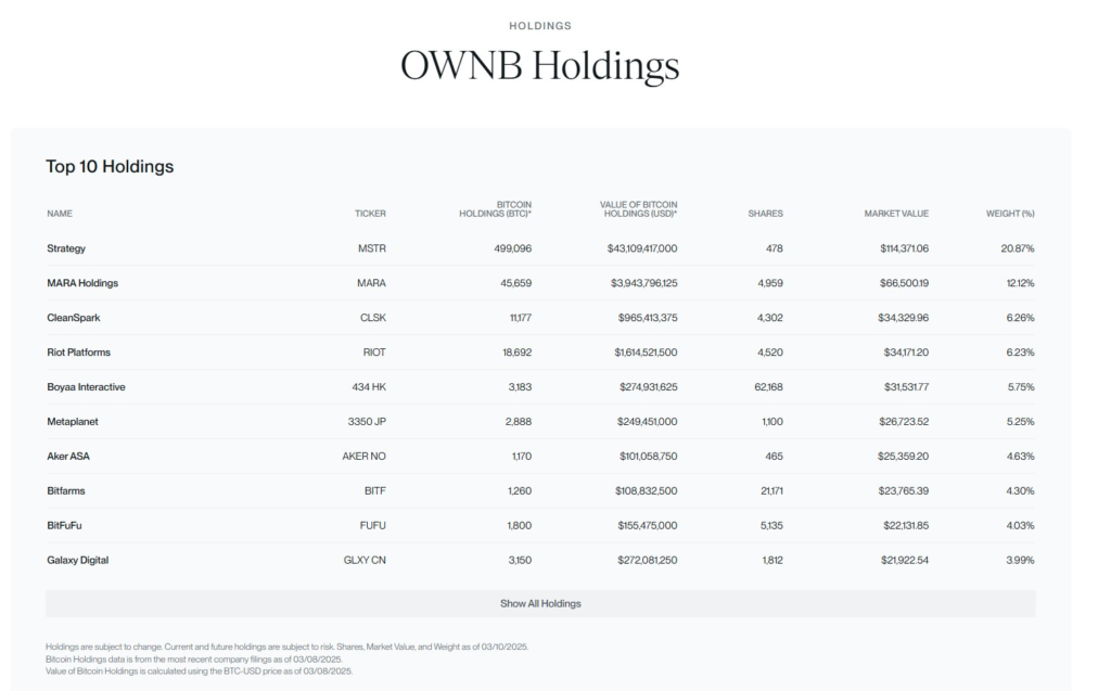از تاریخ ۱۱ مارس (۲۱ اسفند)، بزرگترین داراییهای این ETF شامل سهام شرکت استراتژی (Strategy) با نماد «MSTR» بوده که عملاً به یک صندوق بیت کوین تحت مدیریت مایکل سیلور (Michael Saylor) تبدیل شده است. همچنین، سهام شرکتهای استخراج بیت کوین مانند مارا هولدینگز (نماد: MARA)، کلین اسپارک (نماد: CLSK) و رایت پلتفرمز (نماد: RIOT) در سبد این صندوق قرار دارند.