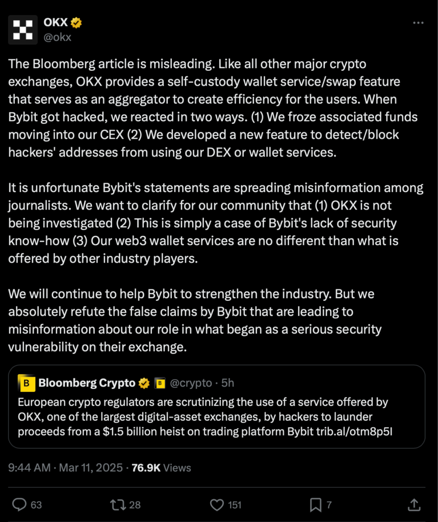 گزارشها حاکی از آن است که نهادهای نظارتی اتحادیه اروپا در حال بررسی سرویس وب ۳ ارائهشده توسط صرافی کریپتو اوکیاکس (OKX) هستند که ممکن است در پولشویی ۱۰۰ میلیون دلار از وجوه هک صرافی بایبیت (Bybit) نقش داشته باشد.