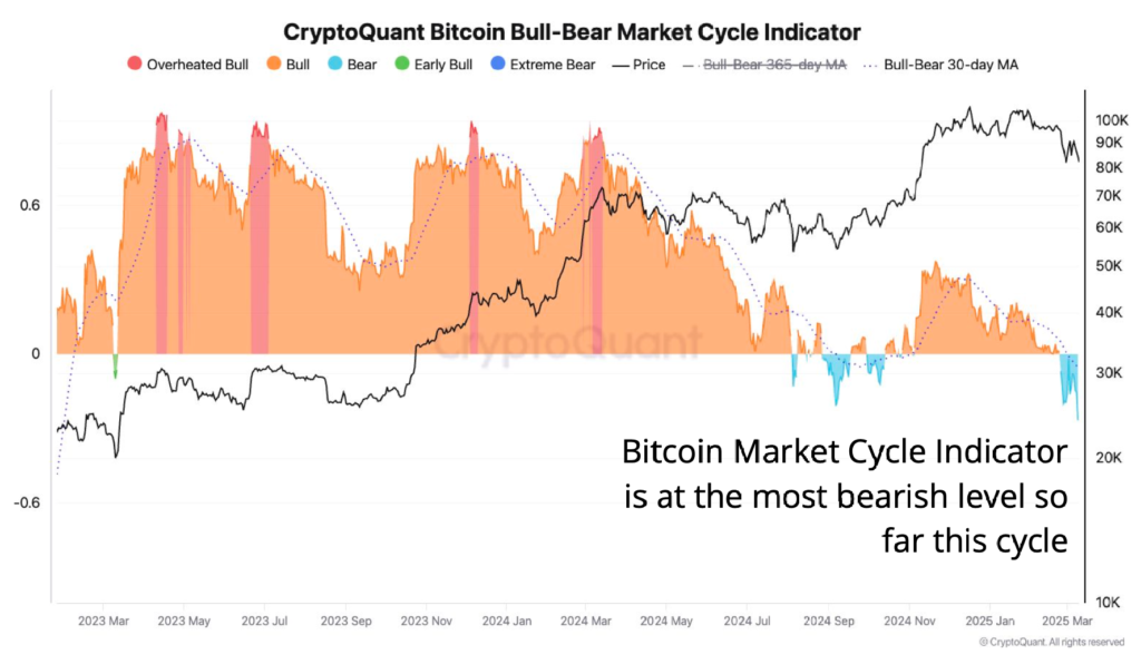 کریپتو کوانت اشاره کرد که شاخص چرخه بازار گاوی-خرسی بیت کوین در پایینترین سطح خود در این چرخه قرار دارد.