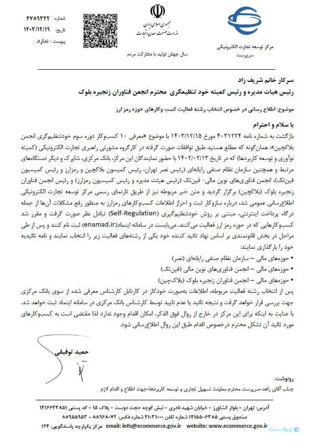 مرکز توسعه تجارت الکترونیک در جدیدترین نامه خود از کسبوکارهای رمزارزی که در طرح خودتنظیمگری حاضر هستند خواست تا برای حل مشکلاتی مانند درگاه پرداخت، در سامانه اینماد ثبتنام کنند.