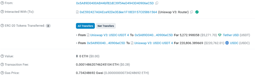 بر اساس دادههای اکسپلورر بلاکچین اتریوم (Etherscan)، این حمله MEV در استخر نقدینگی USDC-USDT در صرافی غیرمتمرکز یونیسواپ نسخه ۳ (Uniswap v3) رخ داده است که ۱۹.۸ میلیون دلار ارزش قفل شده دارد.