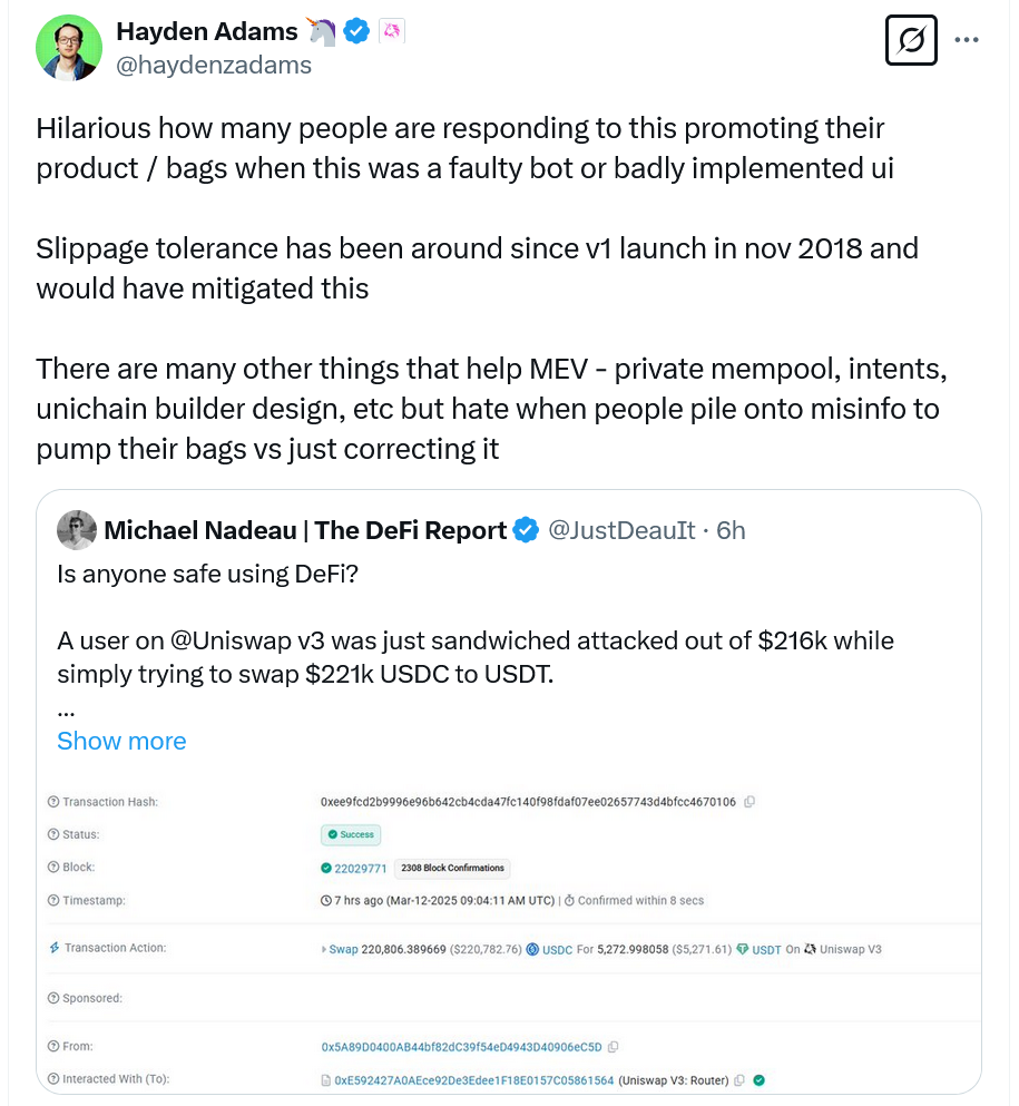 نادو پس از بررسیهای بیشتر تأیید کرد که این تراکنشها از رابط کاربری (Front-End) یونیسواپ انجام نشدهاند. یونیسواپ در نسخه رسمی خود مکانیزمهای محافظتی برای مقابله با حملات ساندویچی مانند تنظیمات پیشفرض اسلیپیج (Slippage) و حفاظتهای MEV دارد که این حملات را دشوارتر میکنند.