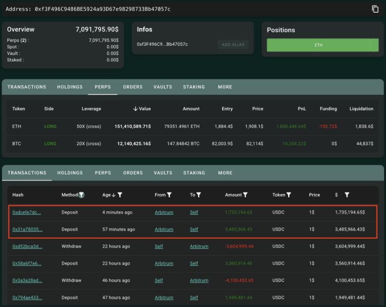 پلتفرم تحلیل بلاکچین اسپات آنچین (Spotonchain) مجموعهای از معاملات اهرمی سنگین را که در هایپرلیکویید انجام شدهاند، گزارش کرده است. بر اساس تحلیل آنها، یک معاملهگر با سرمایه زیاد، مبلغ ۵.۲۲ میلیون دلار به این پلتفرم واریز کرده تا پوزیشنهای خرید (لانگ) اهرمی در بیت کوین و اتریوم باز کند.